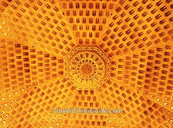 屋顶覆盖着青铜瓦,类似于陶土瓦。屋顶下挂着铜制的编钟,风吹起来就发出悦耳的声音。