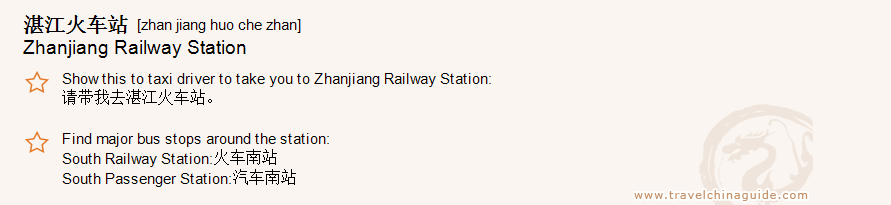 南站:9号,城岳-霞山,宝港线,漳港线。然后沿着建设路向西北走约400米(440码)到湛江火车站。