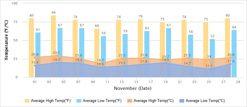 | 11月 | 温度 | 日出/日落 | Humi - 迪蒂 (%) |