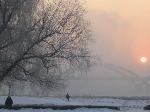 一个独特的冬季仙境,由温暖的河水遇到冰冻的雾温度。一场厚厚的霜冻使沿河的一切都变成了白色。