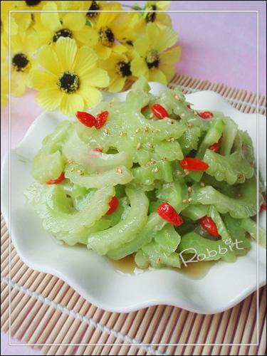 2,将泡好的苦瓜捞出沥干水分,加入盐,味精,少许白糖,香油,芝麻油和枸杞拌匀就好了! 2、浸泡苦瓜布朗去除水、盐、味精、少许糖、香油,芝麻油和枸杞拌匀好!