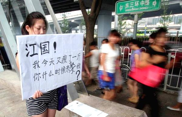 我看到这张照片Chinadaily BBS。一个女孩站在北京附近的一个地铁入口在北京,拿着纸板在她的手中。单词在黑板上“江泽民郭,我今天输了500克。当你愿意嫁给我吗?”