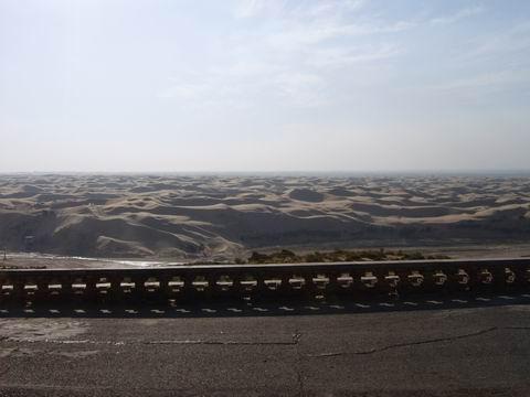 有了常规的地理知识,我在车上寻找地形上的迹象,表明我们正在接近一个巨大的沙漠。但令我惊讶的是,风景仍然是绿色的,种植和郁郁葱葱,而路标清楚地表明,我们正在迅速接近我们的目的地。我们甚至正在穿越著名的黄河,距离沙漠的侧翼只有几公里。不是预期中的逐渐变化;只有农田和树木,然后突然间一座沙山从农田上方升起。这种突然令人震惊,就好像某位神在创造我们这个星球的时候,还有一桶多余的沙子,他决定不小心就把它倒在绿色的田野里。
