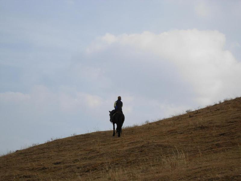 中午,他带我们去了一个帐篷,帐篷里有几十匹马和骑手:马在水槽边喝水休息;人们围着野餐桌。我们的导游很容易就和其他导游以及帐篷的主人打成一片。他们抽着烟,打了几局牌,而我们则喝茶,伸伸弓腿。马儿们一起嘟哝着,咆哮着,跺着脚,不停地移动着。一个小时后,我们的向导来接我们,我们继续朝着天地之间的分界线骑去,直到太阳不再在我们下面产生阴影。