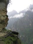 我们一边吃着炒蔬菜和牦牛肉面(接着是水果沙拉),一边沉思着我们不幸的时机,并试图保持积极的态度。在我们吃饭的木阳台上,可以看到浓雾和白云带,我们知道帘子后面的某个地方是山脉、长江和虎跳峡。