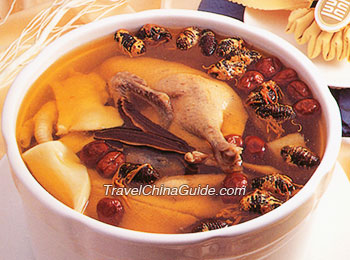 这是著名的客家美食。猪肚子被塞进整只鸡里,然后用文火慢炖。鸡肉和猪肚在炖的过程中会互相吸收对方的味道。鸡肉鲜嫩多汁,猪肚很有嚼劲。