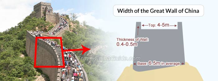 长城宽约8-10米(26 - 33英尺)。的居庸关长城宽度变化很大,最大宽度为16.7米,最小宽度为1.2米(3.9英尺)。