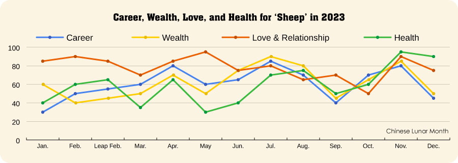 根据他们对2023年运气的月份预测,出生在绵羊/山羊/公羊年的人在2023年将遇到更多的好运而不是不幸。他们会做得很好,反过来在4月和7月赚得更多;但在1月、2月、9月和12月,事业和财富方面的运势可能不太好,那时他们最好量入为出。单身人士可能会在1月、2月、4月、5月和11月遇到他们的爱人。3、5月健康运差;这几个月要多注意身体不适。