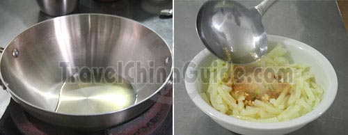 把锅放在大火上烧热。加一些食用油加热到90℃(194℉)。用勺子舀出油,倒入调味料,加入清面。 |