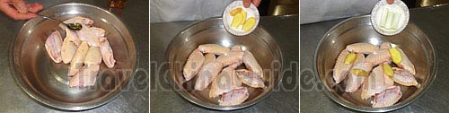 将清洗干净的鸡翅放入盆中,加入料酒和一半葱段和姜片。混合均匀,腌制15-20分钟。 |