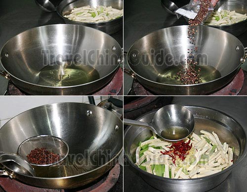 把水从锅里倒出来。把它放在大火上加热。加一些食用油,加热至90度左右 |