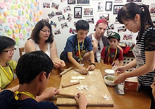 2013年8月22日,来自美国的Matthew先生,Dilanthi女士,Kamyar先生,Gita女士和John先生,来自加拿大的Esther女士和Deepani女士,来自英国的Hiral先生和Aarti女士加入了我们在西安的家庭访问,在西安,熟练的女主人提供了中国烹饪课程。他们都对包饺子感兴趣。虽然包饺子看起来很简单,但它需要很高的技巧。他们中很少有人擅长这个,但整个过程真的很有趣。他们还学会了做冷芝麻菠菜,结果非常成功。详情见马修先生的反馈 -
