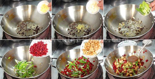 锅里留一些食用油,开大火。油热后,加入花椒籽、葱花、姜末和蒜末,炒20秒左右出香味。加入干辣椒段,翻炒30秒。加入炒好的鸡丁,翻炒1分钟左右。倒入第二步准备好的调味汁,再翻炒30秒。 |