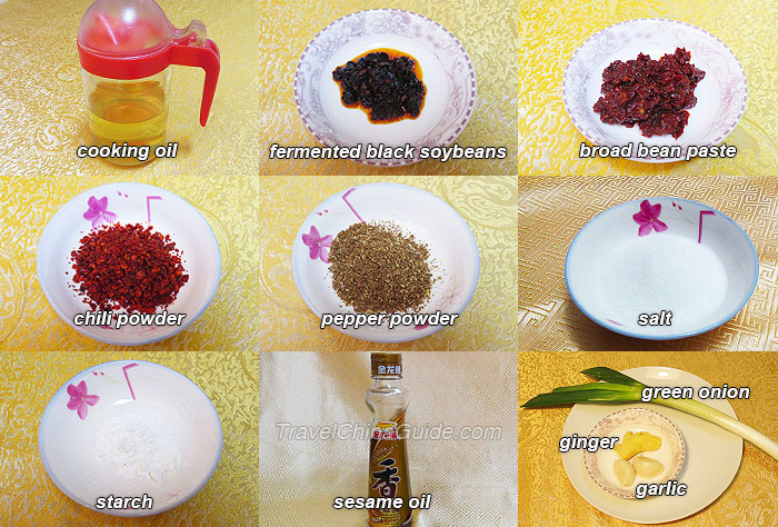 调味:食用油;发酵黑豆;豆瓣酱;辣椒粉;辣椒粉; 盐;淀粉;香油;绿色洋葱;大蒜;姜 注:以上食材和调味料的用量可根据个人口味适当使用。 |