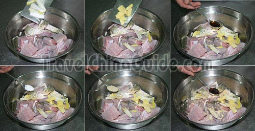 把草鱼块倒入一个小盆里。加入葱段、姜片、料酒、盐、五香粉和酱油。用筷子搅拌均匀,腌制15-20分钟。 |